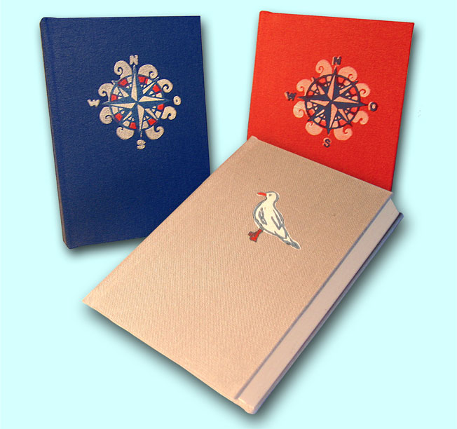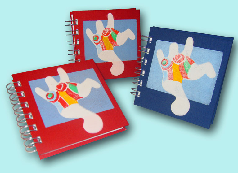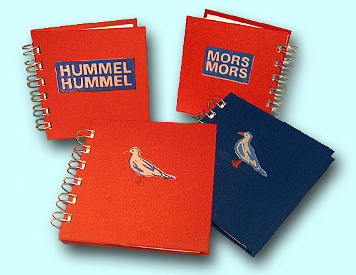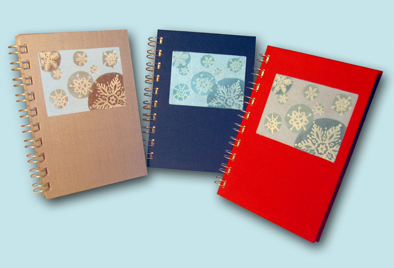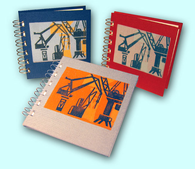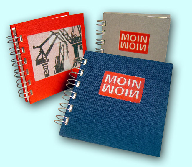 Auch mit der Linolschnitt-Technik lassen sich schöne Effekte erzielen. Für jede Farbe wird eine Platte angefertigt und dann auf Papier oder Textil gedruckt. Die hier gezeigten Beispiele wurden später teilweise zu Bucheinbänden weiterverarbeitet.